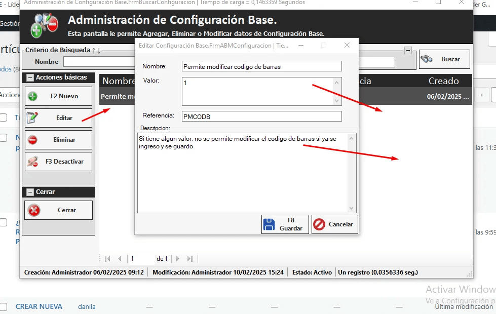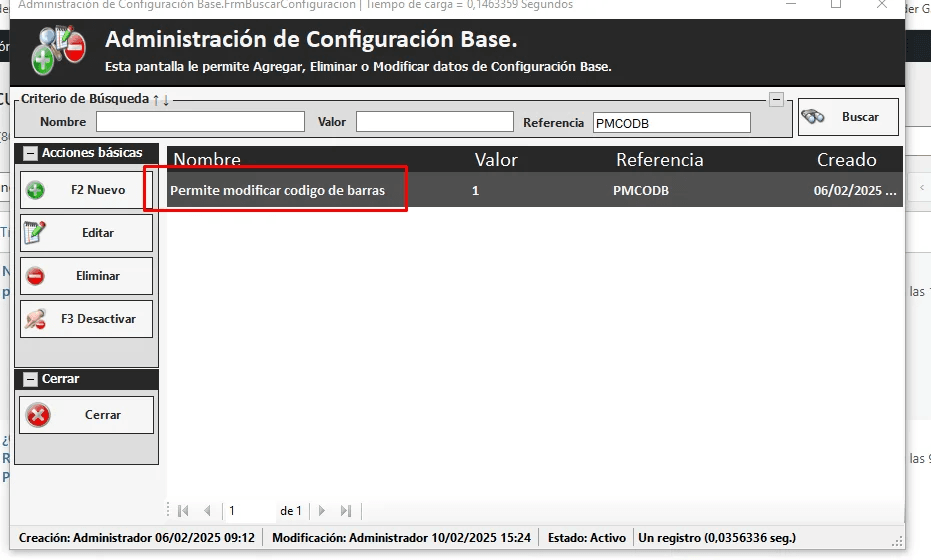 Colocamos la referencia PMCODB para que aparezca: PERMITE MODIFICAR CÓDIGO DE BARRAS. Editamos y dentro de la pantalla a VALOR le asignamos un número. Lo que impide modificar el código de barra una vez que se guardo.