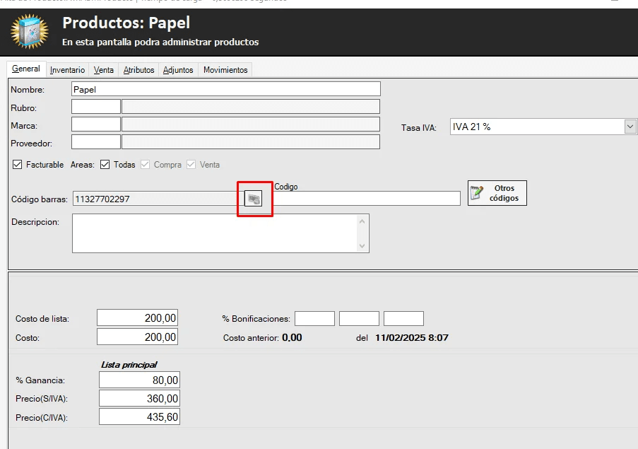 Por ultimo para chequear que esté funcionando probamos con un producto. Lo guardamos y tiene que aparecer en gris el botón de código de barras.