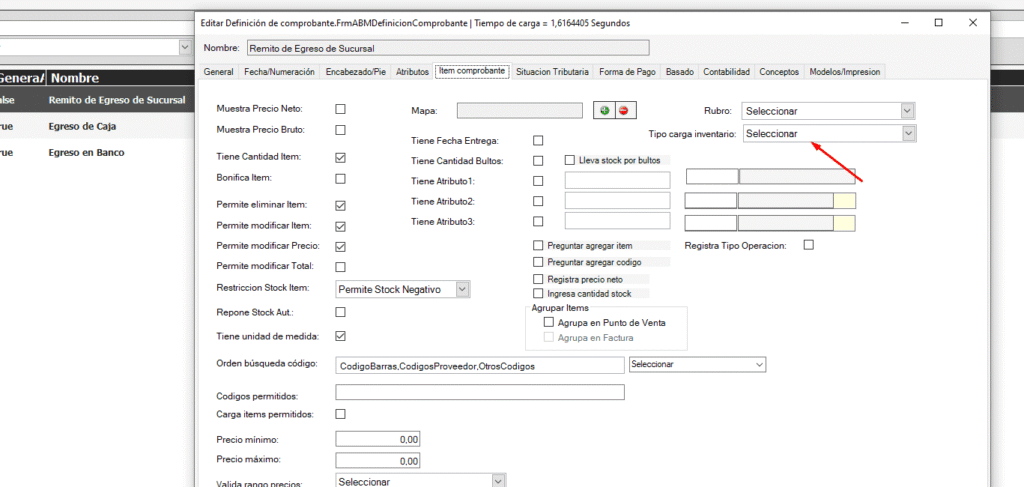 En Configuración -> Tipos de Comprobante, seleccionamos Remitos de Egreso de sucursal y le damos a Editar. En la solapa Ítem Comprobante nos aseguramos que en Tipo carga inventario tenga seleccionado selecciona existente.