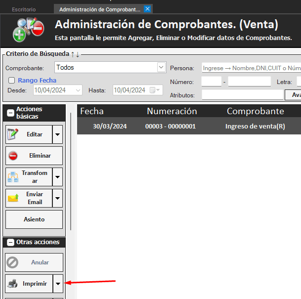 - Venta – consultar comprobantes de ventas, seleccionas el comprobante a guardar en PDF y presiona en la flechita al lado del botón IMPRIMIR
