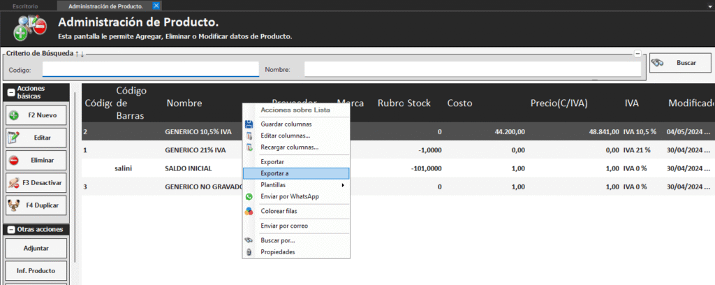 * Inventario – Administración de Inventario – Productos. Luego, buscamos los productos y hacemos click botón derecho sobre fila negra del encabezado de las columnas, y en la grilla «exportar a…»