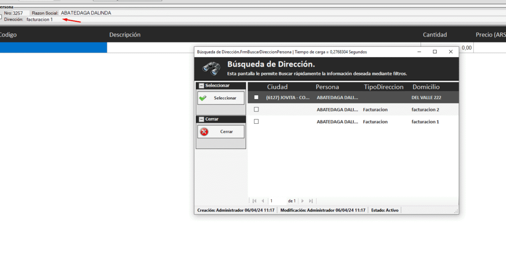 Cuando vamos a factura a ese cliente en el campo de dirección solo hacemos doble clic y se abre una pantalla donde podemos elegir la dirección para facturar.