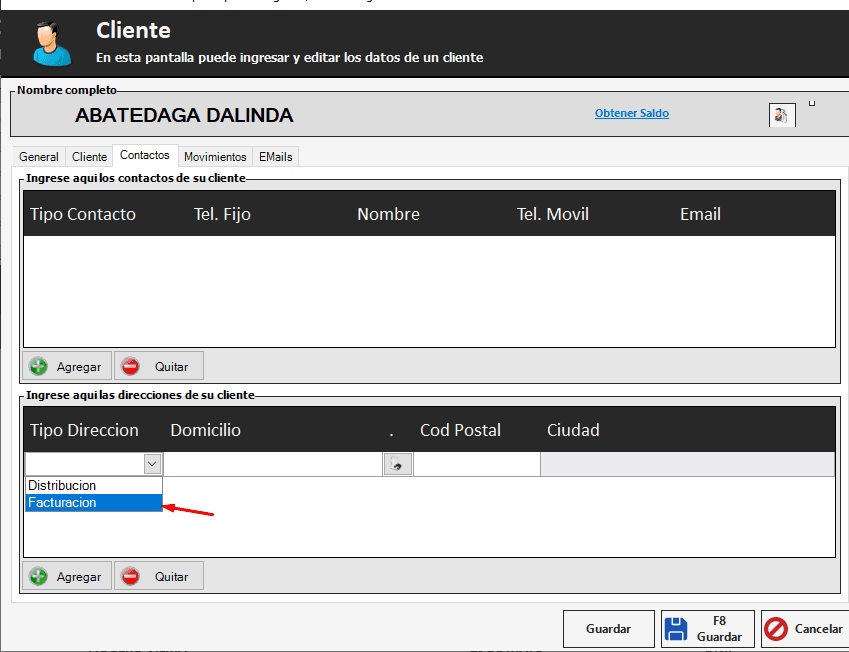 Desde la solapa de CONTACTOS que esta en la edición del cliente se agregan las direcciones. Importante en tipo de dirección ponemos FACTURACIÓN.