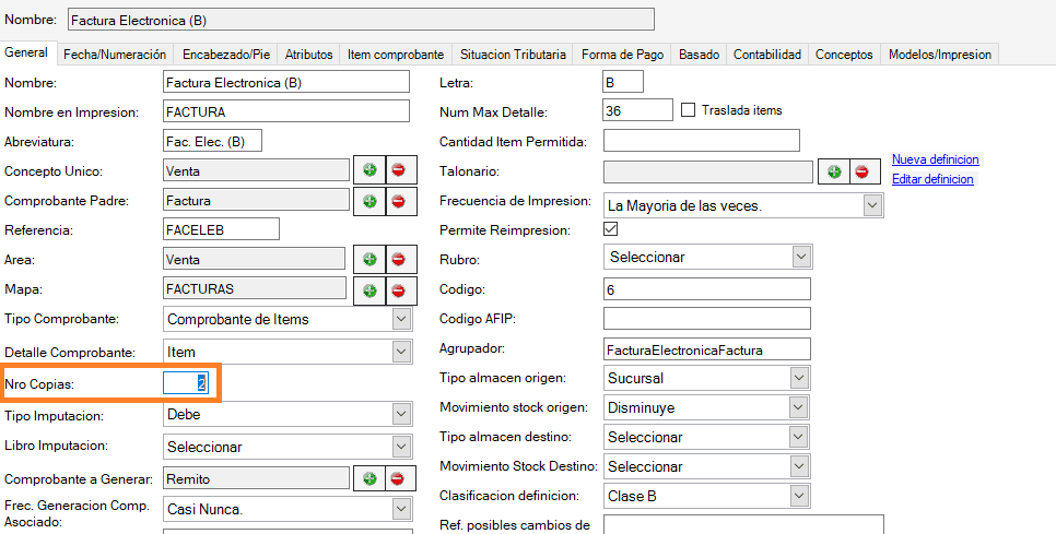 Se nos abrirá la siguiente pantalla y en la solapa «General» vemos que se muestra un campo llamado «Nro Copias» con el valor 2.