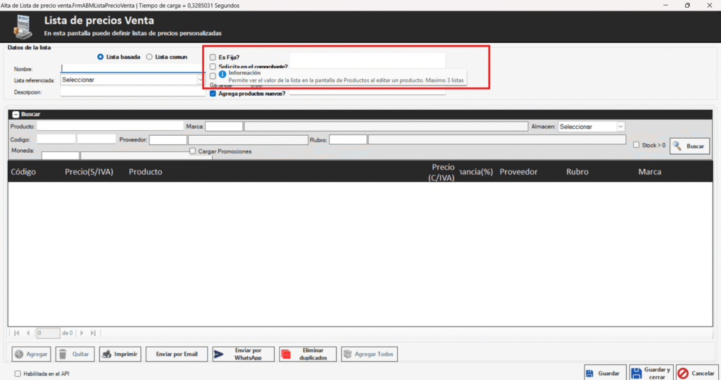 Al crear una lista de precio nueva y desea que le aparezca en la pantalla del producto, deberá tildar es FIJA, y le permitirá ver el valor de lista en la pantalla del producto al editar un producto. (Máximo 3 listas)