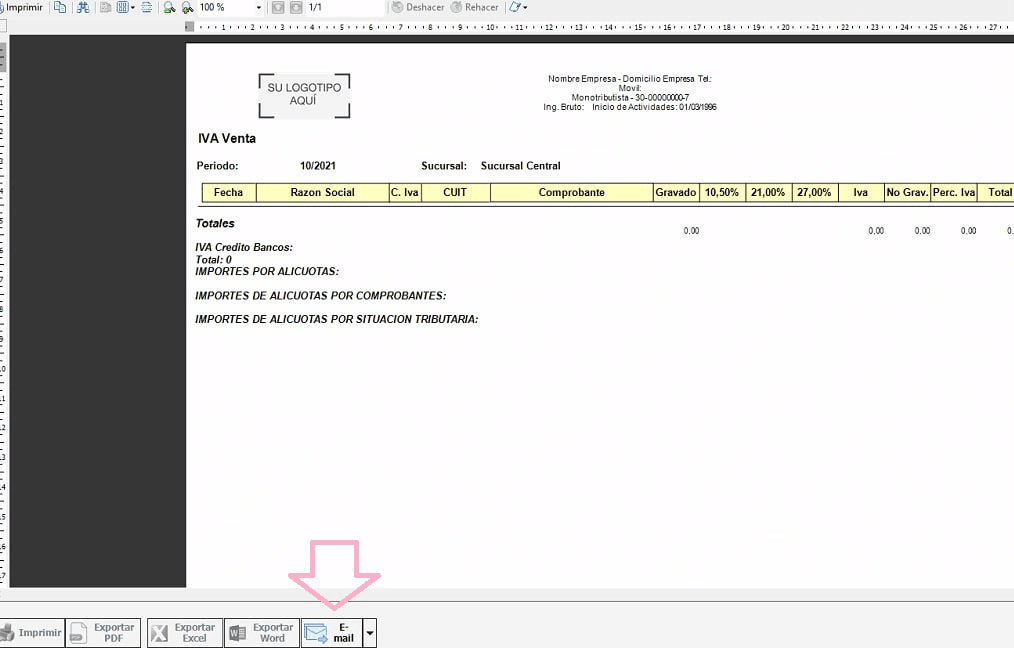 Luego, te genera el Reporte y en la barra que se encuentra abajo, aparece el botón E-mail, lo seleccionamos y te permite enviar por mail dicho informe.