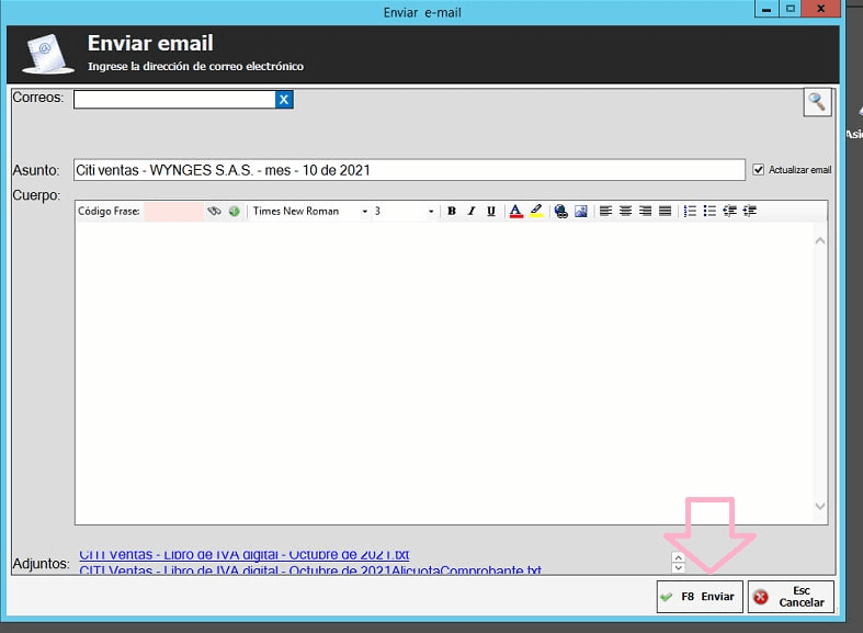 Y por último, abajo nos aparece «Adjunto» en el cual se muestra ambos informes generados. Detallamos el correo y lo que deseamos escribir en el cuerpo del mail y lo enviamos.