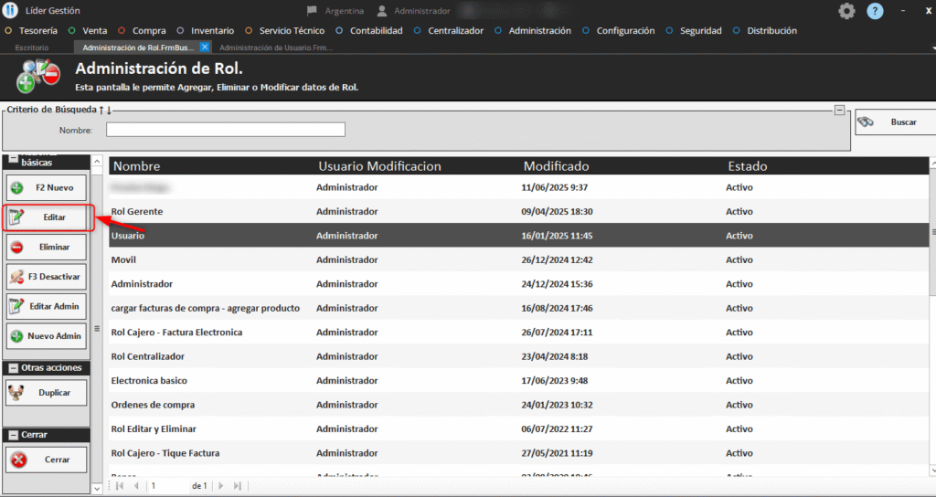 Nos dirigimos al menú “Seguridad” →“Roles”, elegimos el rol al que necesitamos habilitar el informe y le damos al botón “Editar”.