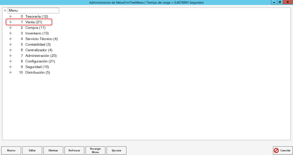Nota: Para identificar el nombre de una opción interna, para saber a qué leyenda del menú corresponde, ir a el menú SEGURIDAD → MENU, ahí podemos ver el nombre en TAREA.