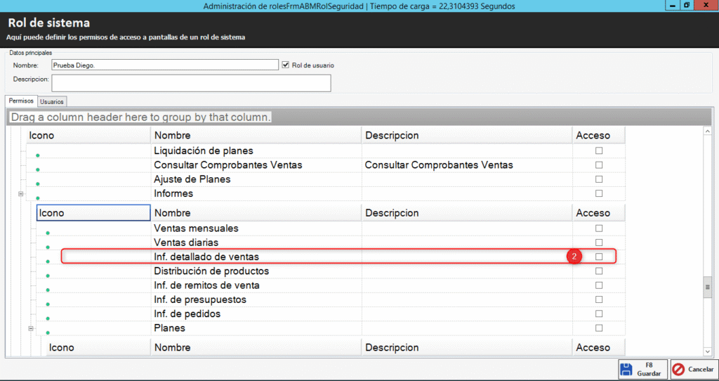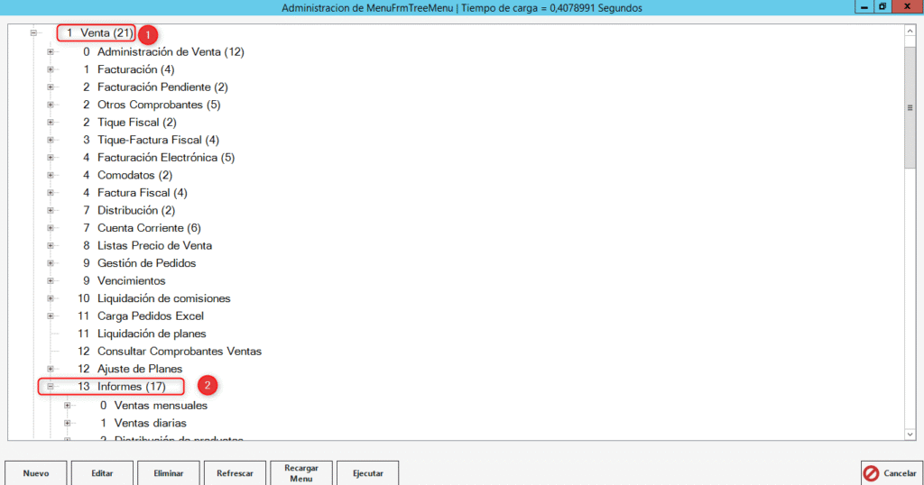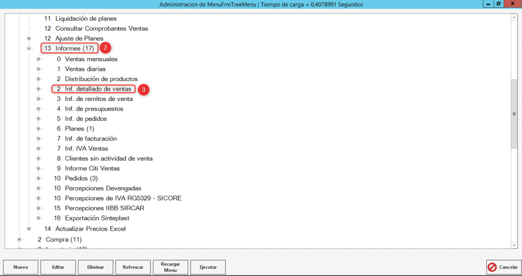 Todo lo que vemos dentro del menú es lo que está habilitado, si la opción “Informe detallado de ventas” no se encuentra en esa lista, significa que debemos agregarla.