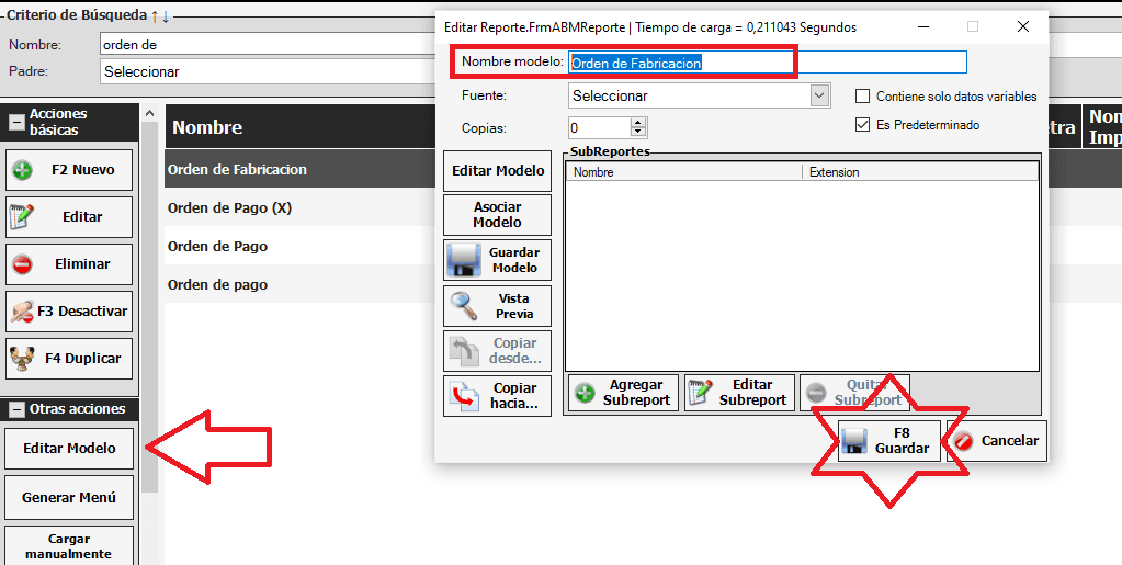 Seleccionamos la orden de fabricación que acabamos de editar. Hacemos click en el botón «Editar modelo» y ene l campo Nombre modelo se lo cambiamos por «Orden De Fabricación». Por último le damos a «Guardar».