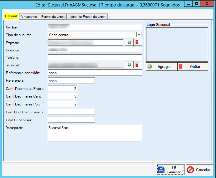 Luego editamos la dirección, teléfono y localidad de la sucursal en la pestaña «General», entre otras configuraciones.