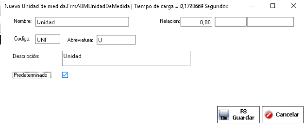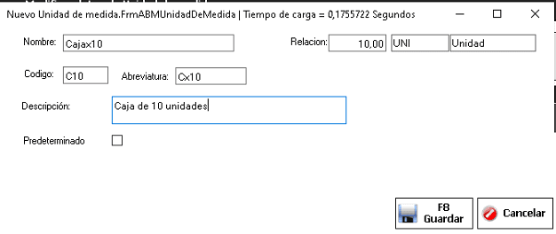 - Nos dirigimos al menú “Inventario”, “Administración de inventario” y elegimos la opción “Unidad de medida”. Creamos y le colocamos el nombre de la unidad. Nota: “caja x 10 relación 10”.