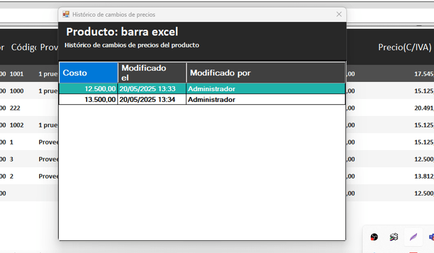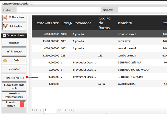 Observación: Es importante señalar que esta opción es bastante restrictiva, ya que solo permite acceder al historial de precios de los productos que se han modificado directamente desde el sistema. No podrás ver el historial de precios de los productos que se han cargado de manera masiva a través de una importación.
