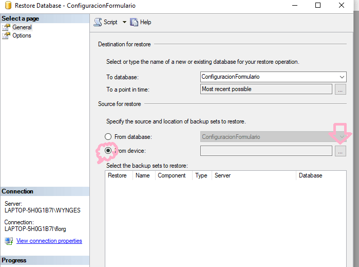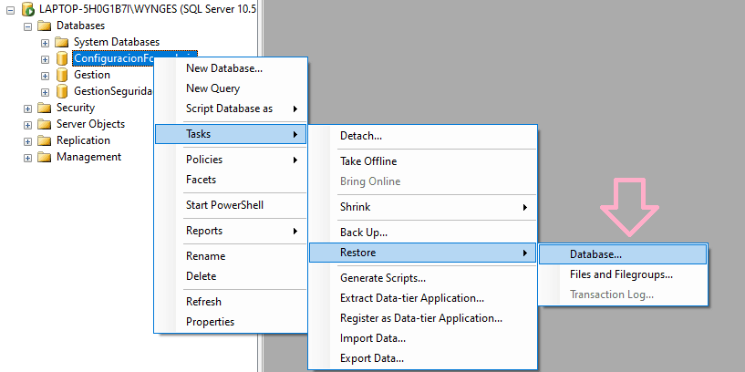 Seleccionamos la base de datos, en este caso ConfiguracionFormulario, le hacemos click derecho Tareas -> Restaurar -> Base de datos