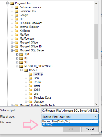 Buscamos la ruta de los archivos backup que copiamos anteriormente, en tipos de archivo debemos seleccionar Todos los archivos (*)