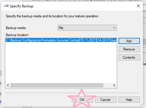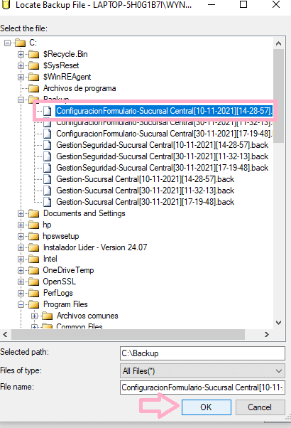 Seleccionamos el archivo (siempre tiene que ser el mismo nombre que el de la base que estamos restaurando) y le damos a OK