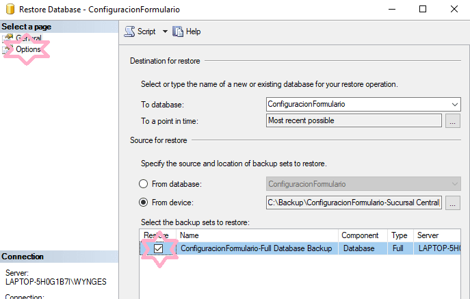 - Una vez dentro restaurar las bases de datos de la siguiente manera (esto se repite para las tres bases de datos):