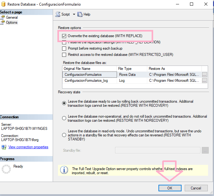 Tildamos la opción Sobreescribir la base de datos existente (Con REPLACE) y le damos a OK