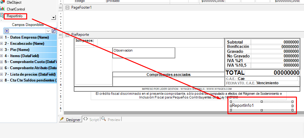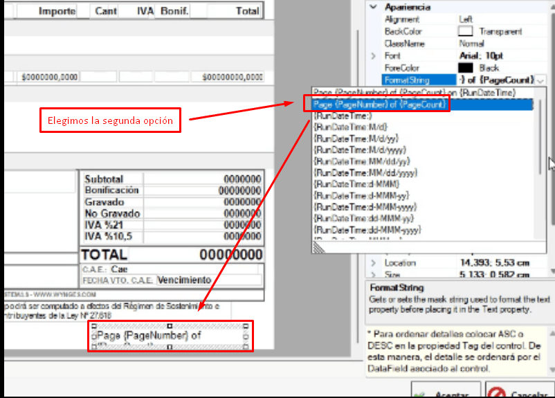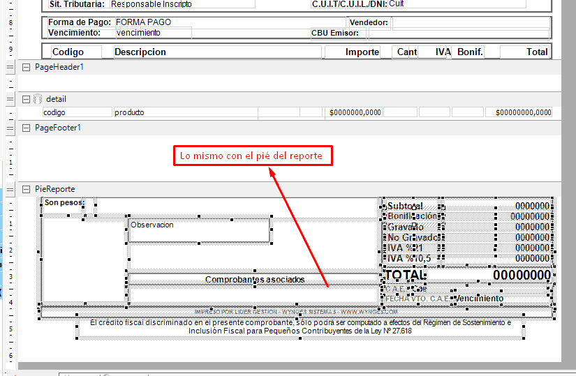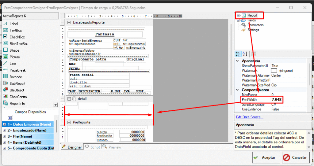 PrintWidth: Es la propiedad que determina la medida del ancho del comprobante. Se ubica en la parte del diseño del comprobante que se llama Report.