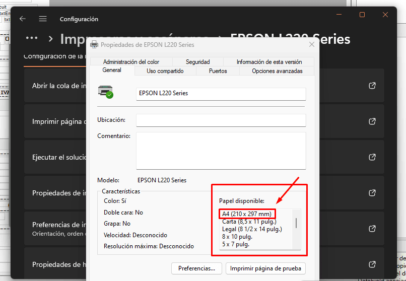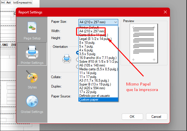 El siguiente punto a tener en cuenta es: Para evitar problemas con la impresión de comprobantes, habría que observar que tipo de papel tiene la impresora como predeterminado dentro de su sistema operativo. Este debe coincidir con el que está configurado dentro de nuestro sistema.