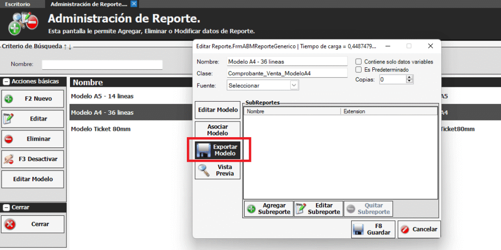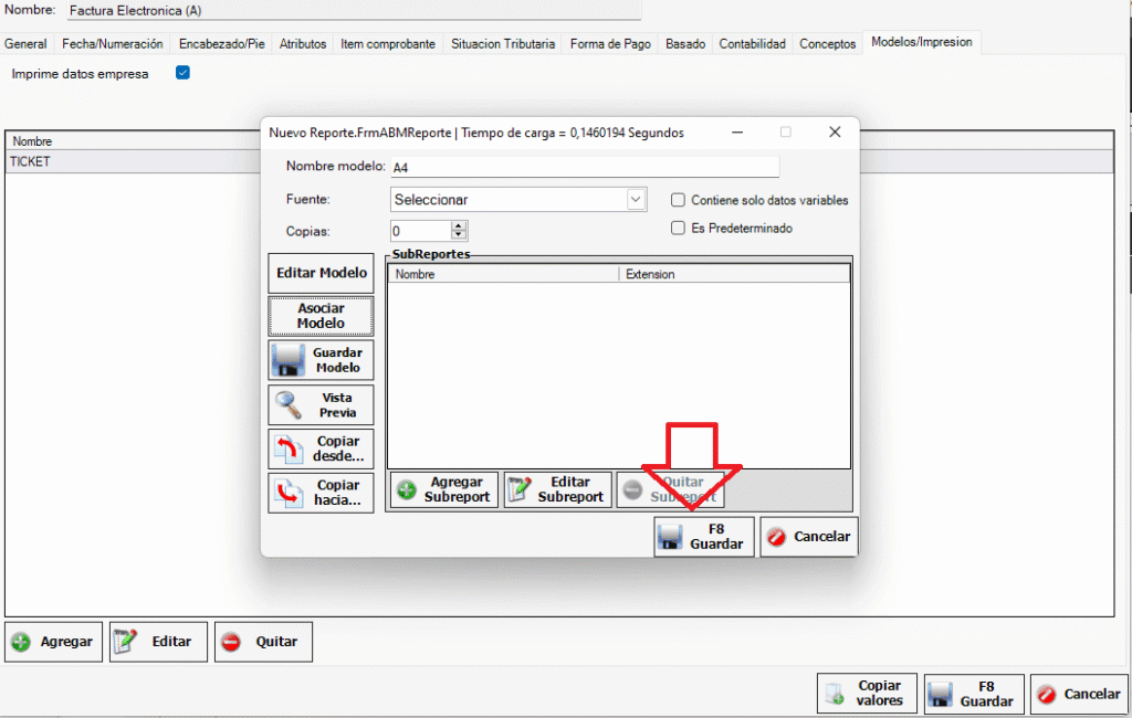 Primero, guardamos el modelo, ya sea en 80mm y en A4. Para ello vamos a Configuración -> Modelos de impresión
