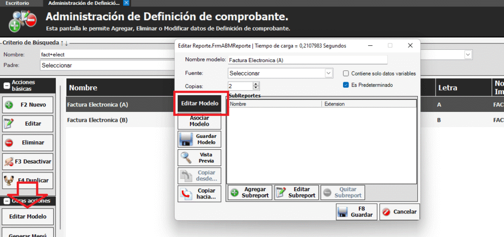 Luego, nos dirigimos a Configuración -> Tipos de comprobante. Y seleccionamos un comprobante, en este caso, Factura Electrónica (A), luego, hacemos click en el botón Editar modelo para ver qué modelo tiene asociado de defecto el cliente