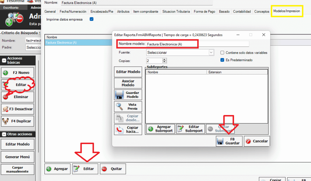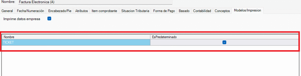 Una vez que sepamos si el modelo que tiene el cliente por defecto es 80mm (ticket) ó A4, hacemos click en el botón Editar, luego, vamos a la solapa Modelos de impresión y editamos el comprobante y en donde dice Nombre le colocamos Ticket o A4 según corresponda y guardamos!