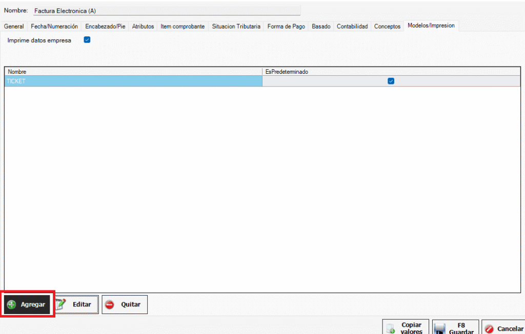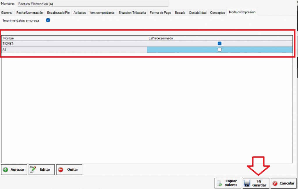Así se verá reflejada la solapa Modelos de impresión, y por último, presionamos el botón Guardar.