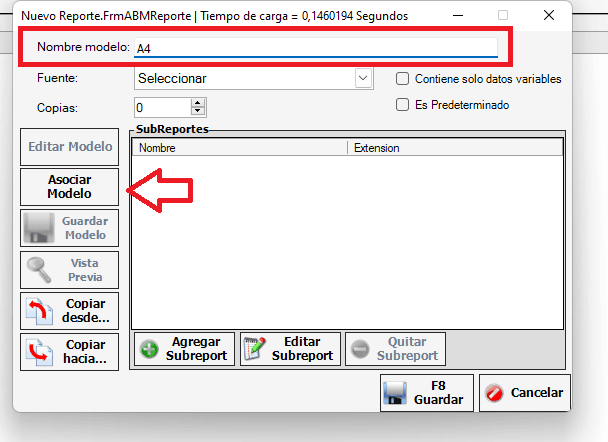 En nombre del modelo colocamos A4 y luego hacemos click en el botón Asociar modelo para agregar el modelo que anteriormente guardamos, en este caso, el modelo A4