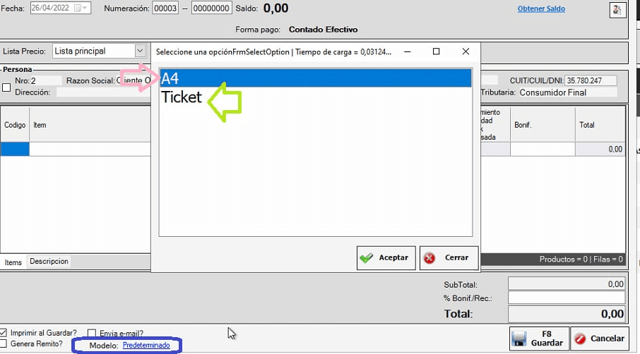 Debajo de la factura aparecerá Modelo: Predeterminado, lo seleccionamos y en esa pantalla podemos seleccionar para imprimir en A4 o Ticket