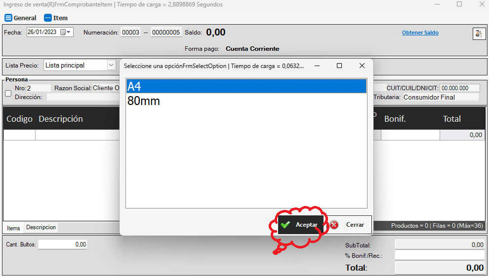 - Por último, presiona en el botón ACEPTAR y la impresión saldrá en el modelo que usted selecciono, ya sea, en 80mm o A4; seleccionando la impresora que corresponda ya sea para imprimir en 80mm o A4.