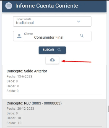 Si vamos a cuenta corriente y buscamos un cliente, podremos ver la cuenta del mismo, con todos sus comprobantes y el saldo final.