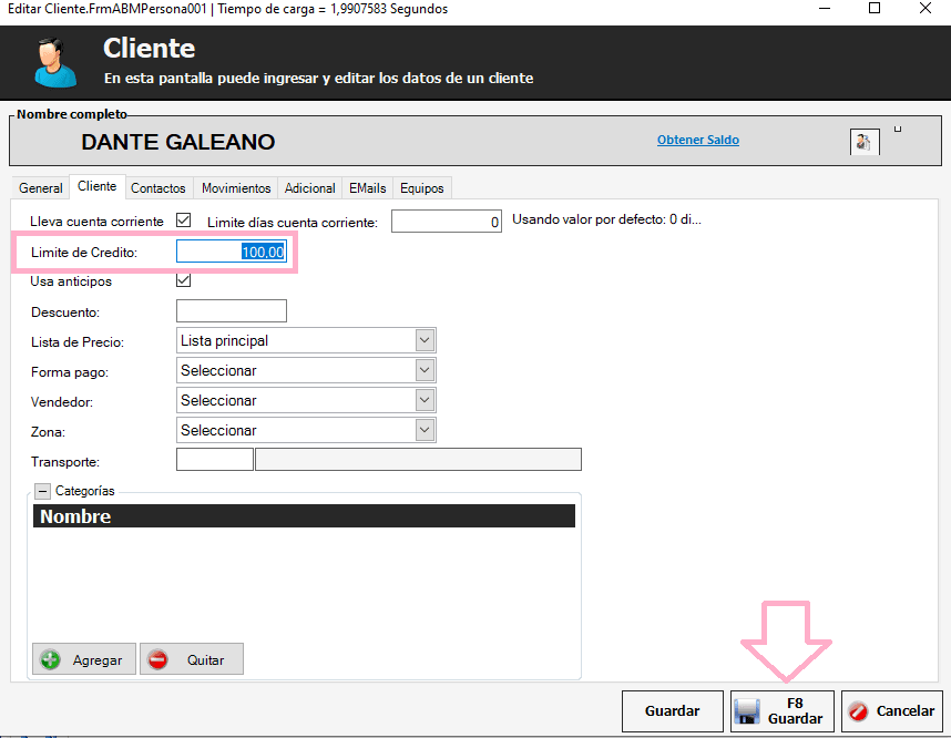 Vamos a Venta -> Administración de venta -> Clientes. Seleccionamos el cliente y hacemos click en Editar, nos dirigimos a la solapa Cliente y en el campo Límite de crédito, colocamos el monto que nos indica el cliente