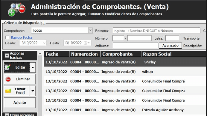 Si el tipo de comprobante es de ventas puede ir a Venta -> Consultar comprobantes de Venta, selecciona el tipo de comprobante (en este caso Ingreso de Venta (R)) y le damos a Editar