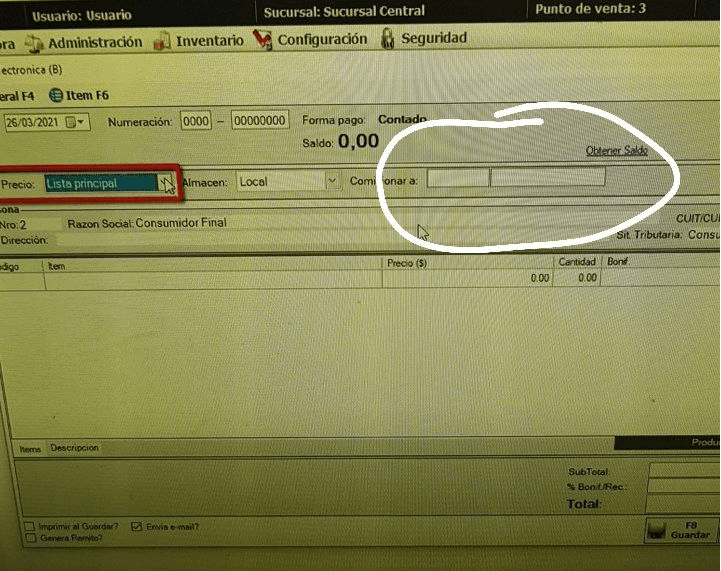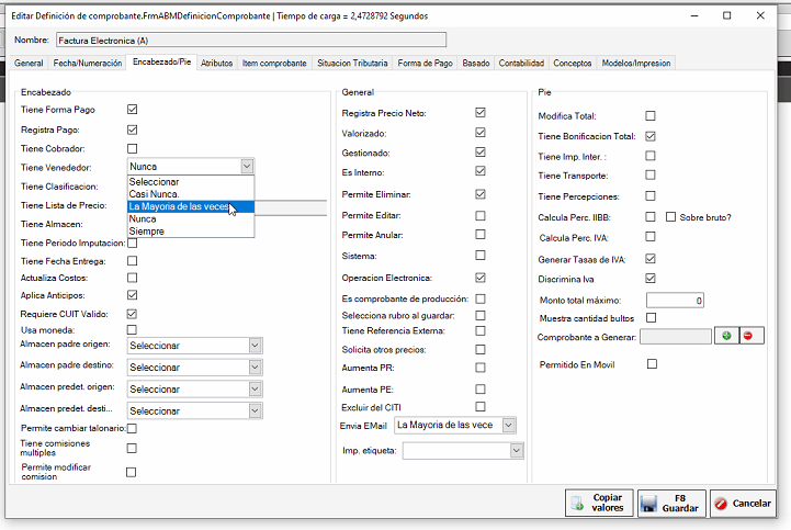 Si tiene el módulo Vendedores y comisiones activado deberá ir a Configuración -> Tipos de comprobante, buscamos el tipo que le falta este campo y le damos a Editar. Una vez dentro vamos a la solapa Encabezado/Pie, buscamos Tiene Vendedor y le damos a La Mayoría de las veces. Le damos a Guardar y listo