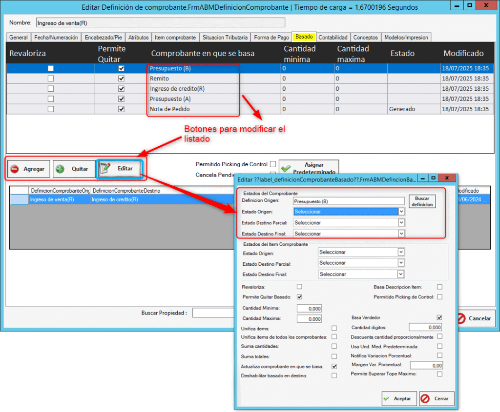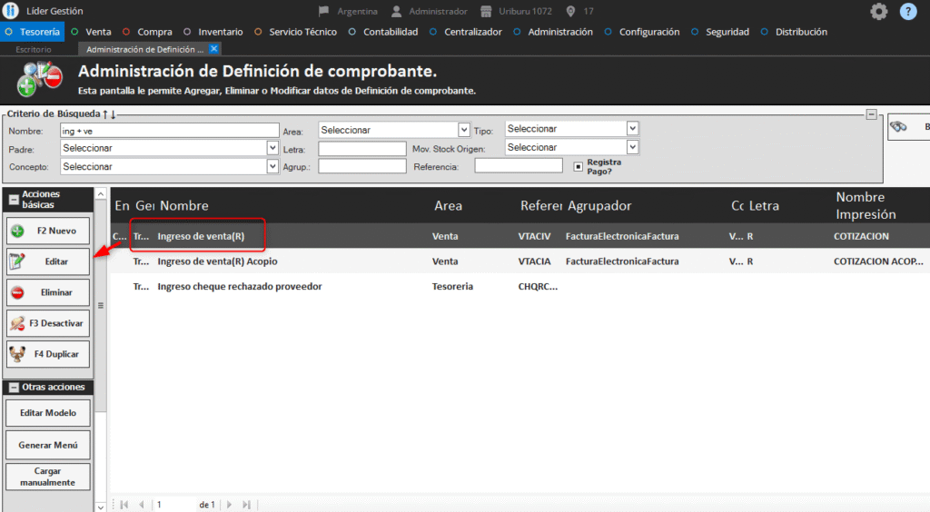 Seleccionamos el comprobante en el cual no aparecen los comprobantes a basar y usamos el botón “Editar”.