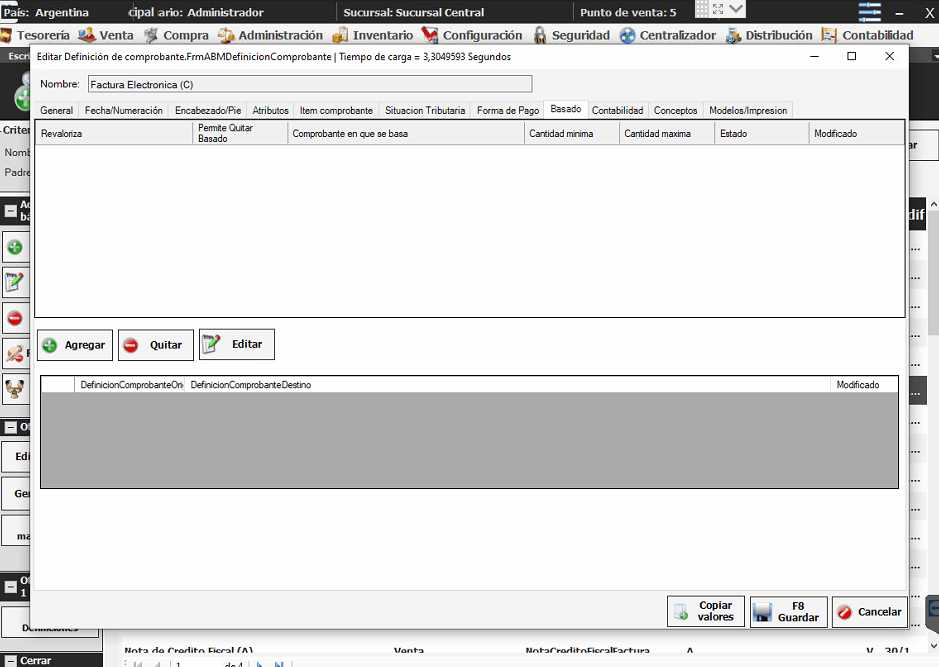 Esto ocurre cuando el comprobante, en este caso Factura Electrónica (C), no tiene configurado el basado. Para ello vamos a Configuración -> Tipos de comprobante, buscamos el tipo de comprobante y le damos a Editar. Una vez dentro vamos a la solapa Basado