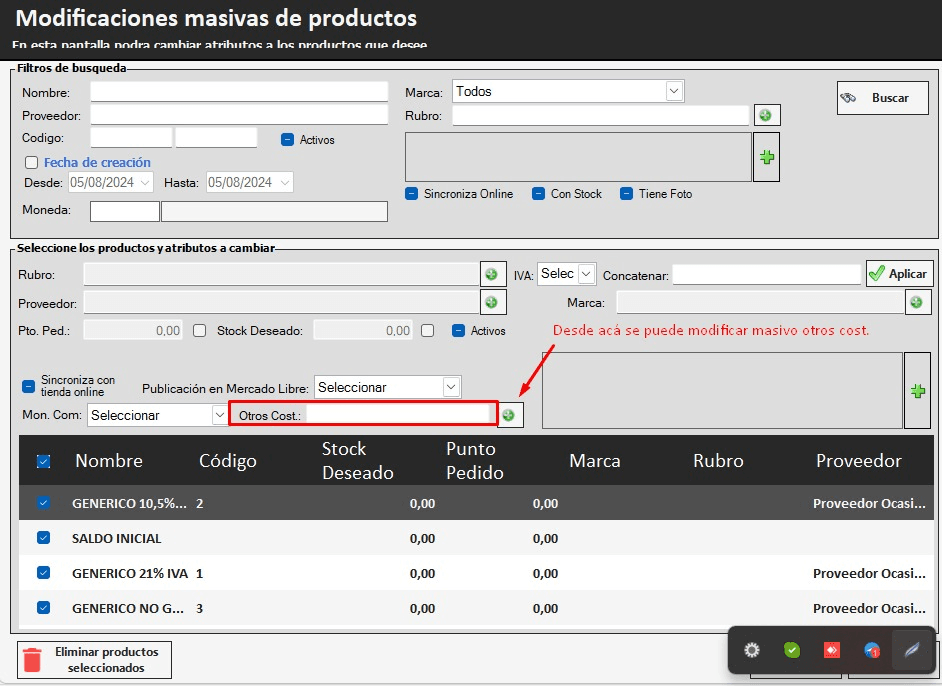 Con respecto a «otros costos» se puede modificar masivo desde: