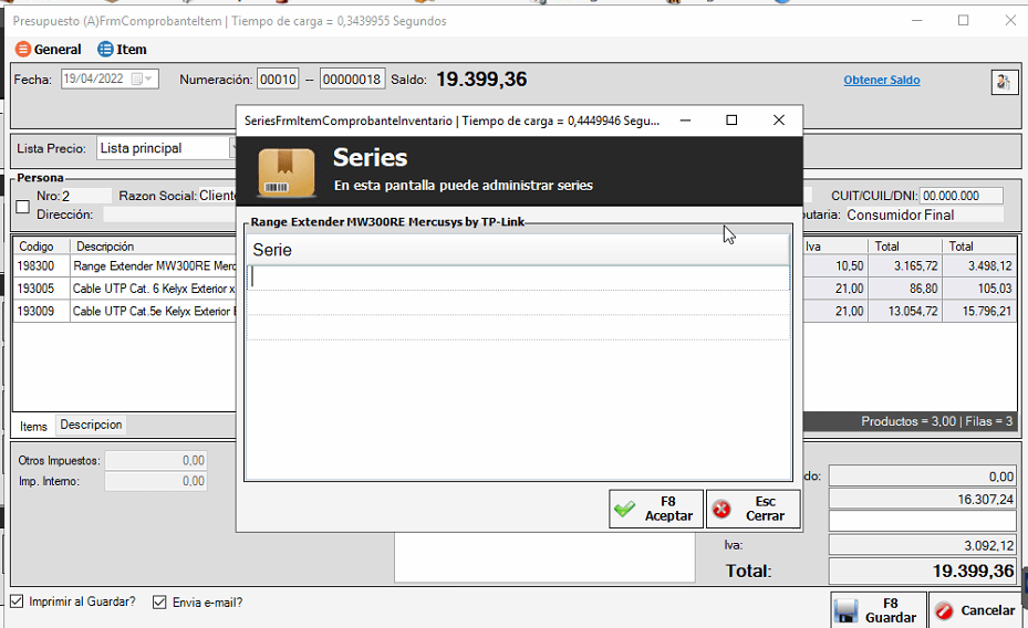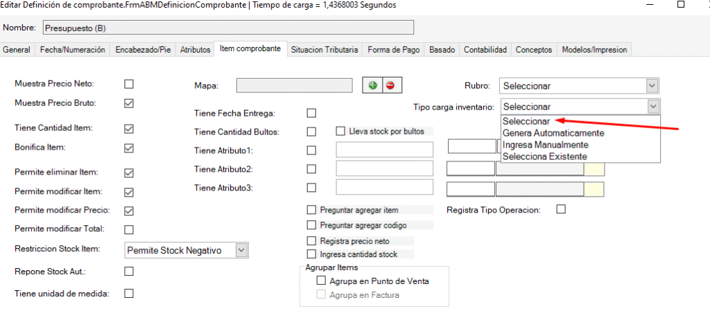 Para que deje de solicitar el número de serie debemos ir a Configuración -> Tipos de Comprobante, seleccionamos los que no deberían pedir esto y le damos a Editar. Dentro de la pestaña Ítem comprobante buscamos Tipo carga inventario y seleccionamos la opción Seleccionar. Le damos a Guardar y listo, ya no debería pedir los números de serie