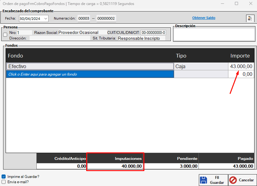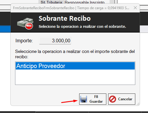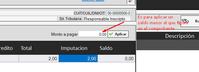 Y en el caso, que el monto sea MAYOR al comprobante, en el campo «IMPORTE» debemos colocar el TOTAL para que se genere un ANTICIPO (saldo a favor que queda en el próximo comprobante).