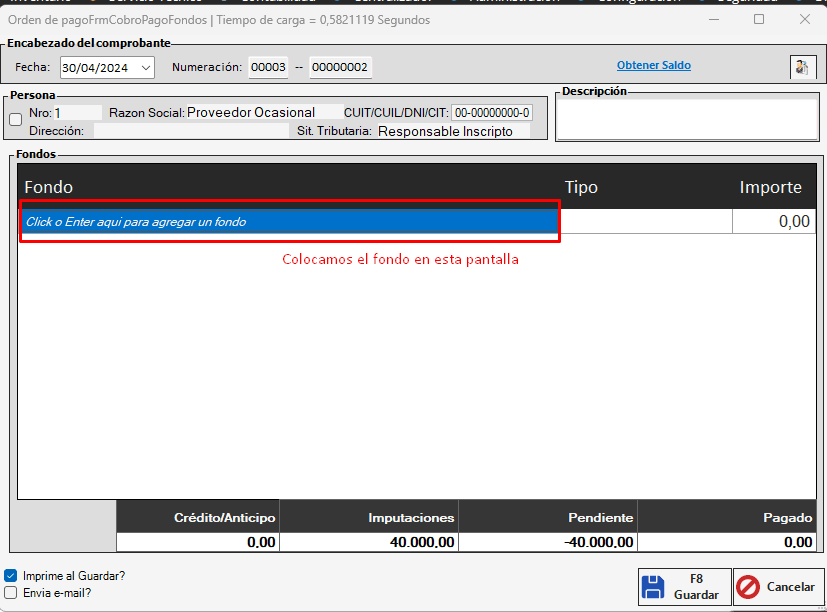 Y al presionar en el botón GUARDAR, se abrirá la siguiente pantalla: seleccionamos ANTICIPO A PROVEEDOR y guardamos.