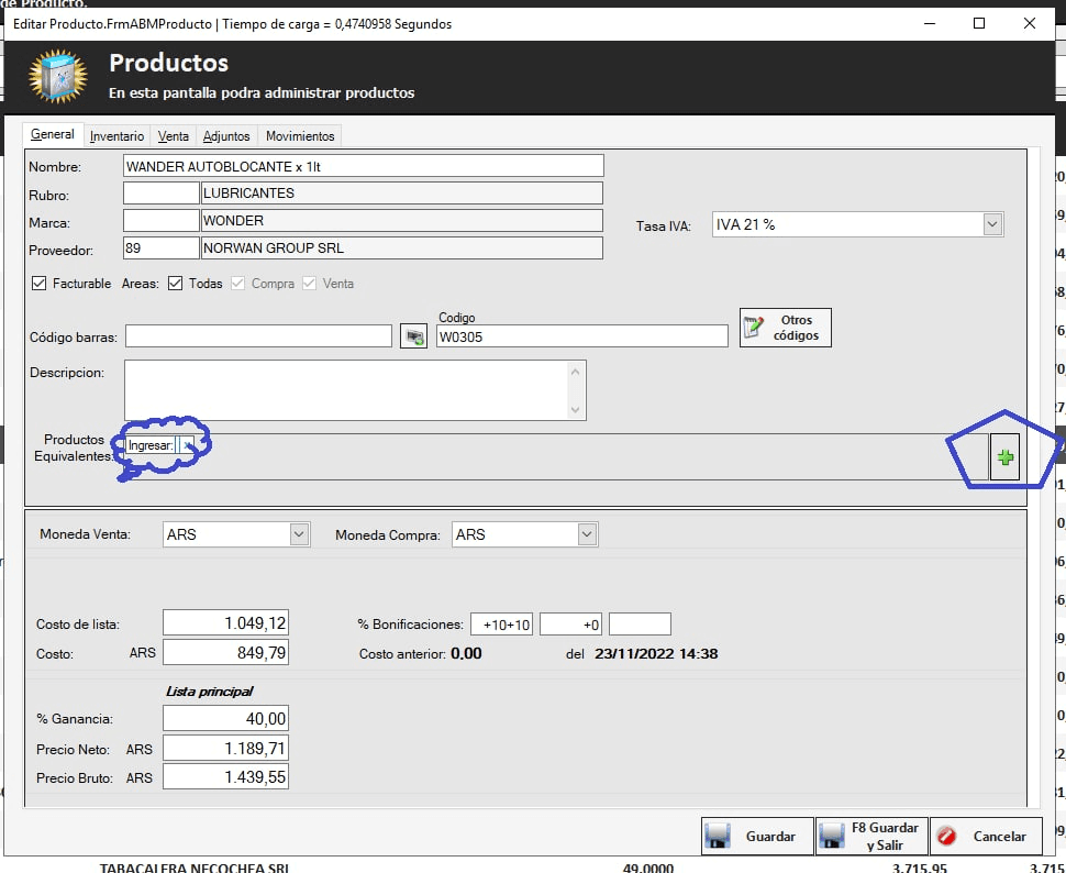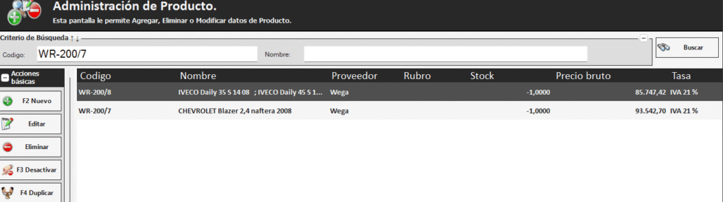 - Por último, guardamos la pantalla. Y al momento de buscar su código aparecen todos los productos equivalentes a ese producto.