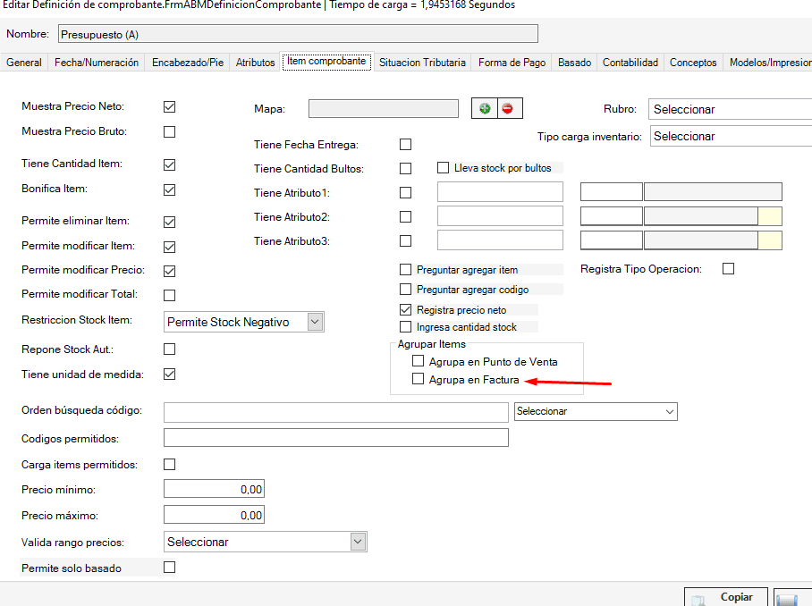 Vamos a Configuración > Tipos de comprobantes seleccionamos el presupuesto y presionamos en «Editar» vamos hasta la solapa Item comprobante y tildamos la opción agrupa en factura y guardamos.
