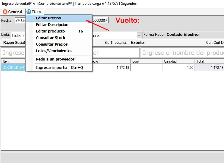 Para eliminar o modificar un ítem se deberá ir a Ítem en la parte superior de la pantalla y seleccionar la opción Editar Precios