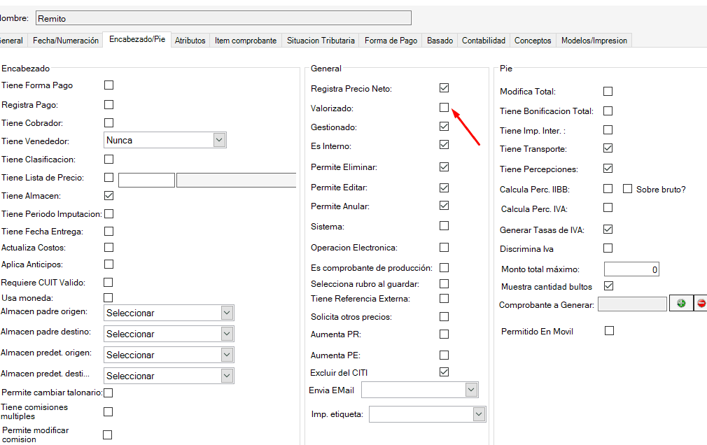 Una vez dentro vamos a la solapa Encabezado/Pie y desactivamos el campo Valorizado