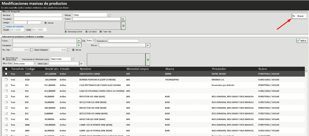 Inventario – Administración de inventario – Modificación de productos, tilda el botón BUSCAR.