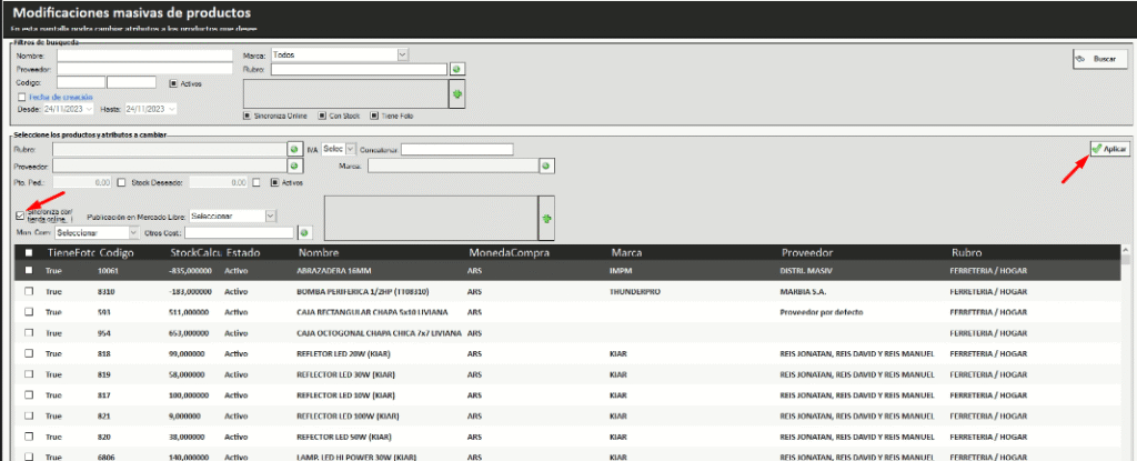 Luego filtra por proveedor, marca, etc… y aplica el botón SINCRONIZACIÓN CON TIENDA ONLINE para sincronizar con la tienda los productos que selecciono.