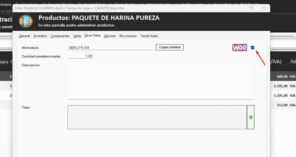 Inventario – Administración de inventario – productos, selecciona el producto que desea sincronizar con la tienda online y se dirige a la solapa OTROS DATOS y tilda la opción “Sincronizar con Tienda Online”.