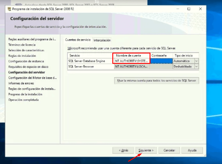 Luego, colocamos el usuario que aparece allí (que es SYSTEM) y tildamos en SIGUIENTE: